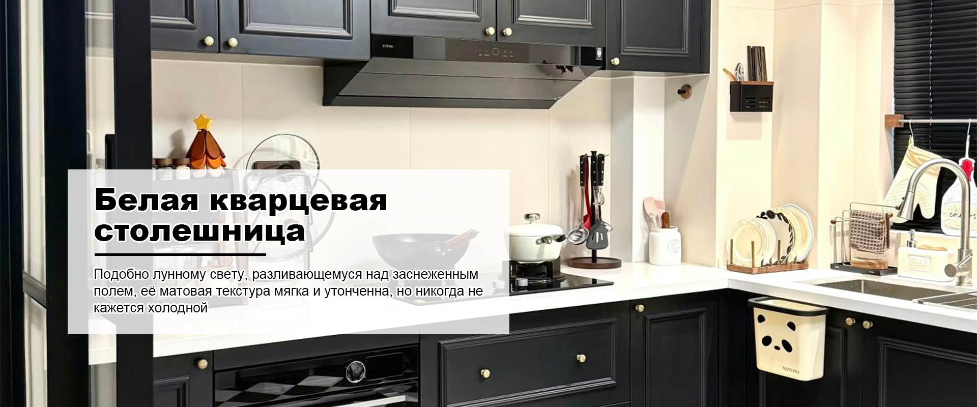 Материалов, которые можно использовать для столешниц кухонных гарнитуров, на самом деле немало, но кварц благодаря превосходным характеристикам и огромному разнообразию расцветок стал предпочтительным выбором для ремонта. 1. Высокая твёрдость, устойчивость к износу Содержание кварца в кварцевом камне достигает 94%, кварцевый кристалл является природным минералом, чья твёрдость в природе уступает только алмазу, его поверхностная твёрдость может достигать 7,5 по шкале Мооса. 2. Лёгкость очистки, хорошая стойкость к загрязнениям Кварцевый камень представляет собой плотный беспористый композитный материал, поверхность которого обладает хорошей устойчивостью к воздействию кислот, щелочей и других веществ на кухне. Повседневные жидкие вещества не проникают в его внутреннюю структуру. Жидкости, длительное время находящиеся на поверхности, можно удалить с помощью воды или чистящих средств, таких как Силит, протерев тряпкой, при необходимости можно скребком удалить остаточные отложения с поверхности. 3. Сильная огнестойкость Природный кварцевый кристалл является типичным огнеупорным материалом, его температура плавления достигает 1300 градусов и выше. Кварцевый камень, изготовленный из 94% натурального кварца, полностью огнестоек, не воспламеняется при контакте с высокими температурами, а также обладает несравненной термостойкостью по сравнению с другими столешницами, такими как искусственный камень. 4. Нетоксичен и безвреден Кварцевый камень не содержит вредных веществ, а плотная беспористая структура материала не оставляет бактериям места для скрытия. Может напрямую контактировать с пищевыми продуктами, безопасен и нетоксичен.